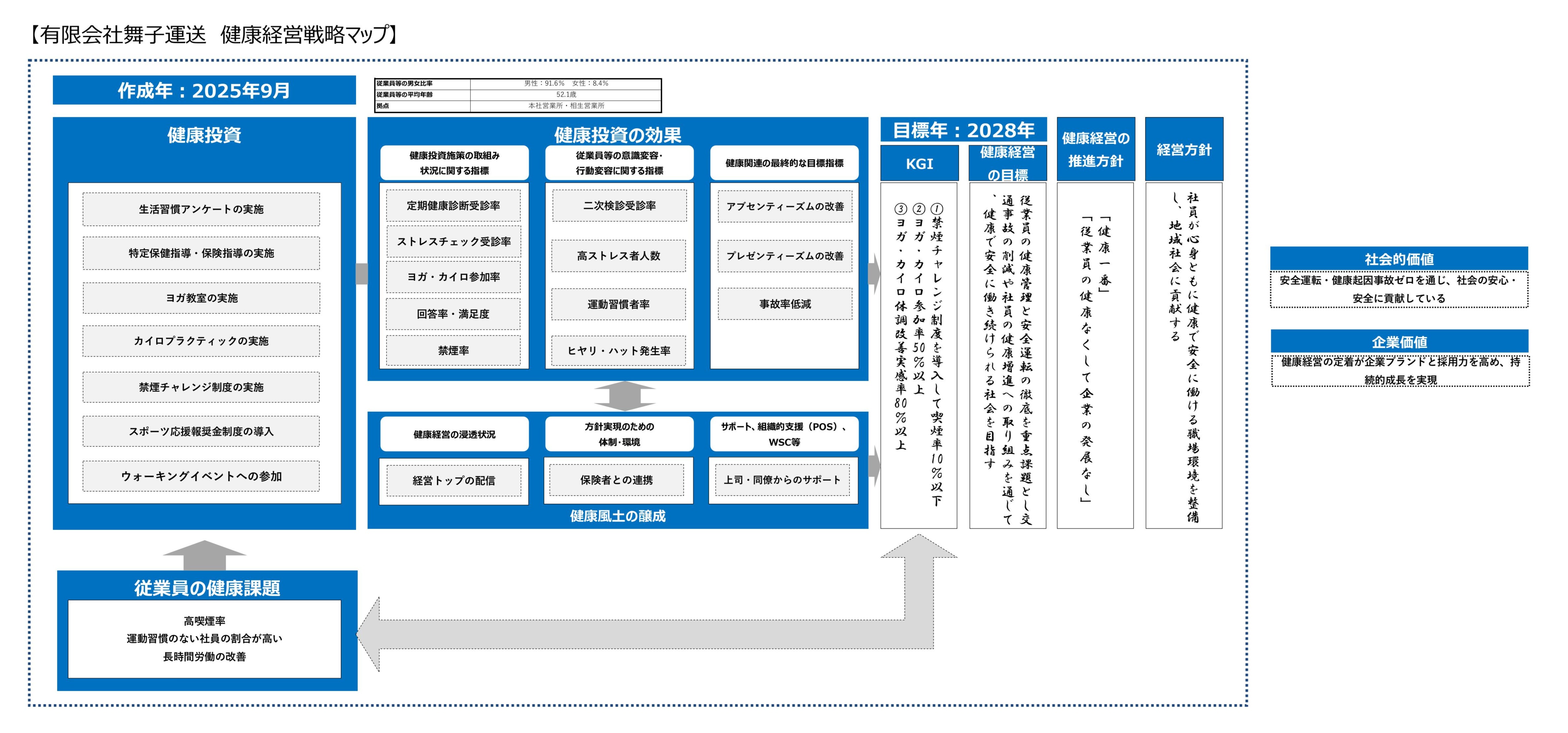 健康診断を一年に一度、全員が受診します。・社員の体重と血圧を毎朝、測定します。・社内では分煙を行います。メタボ社員を減らし、社員全員が健康で、豊かな生活を送るためわが社の今年の目標は、「健康一番」に決めました。