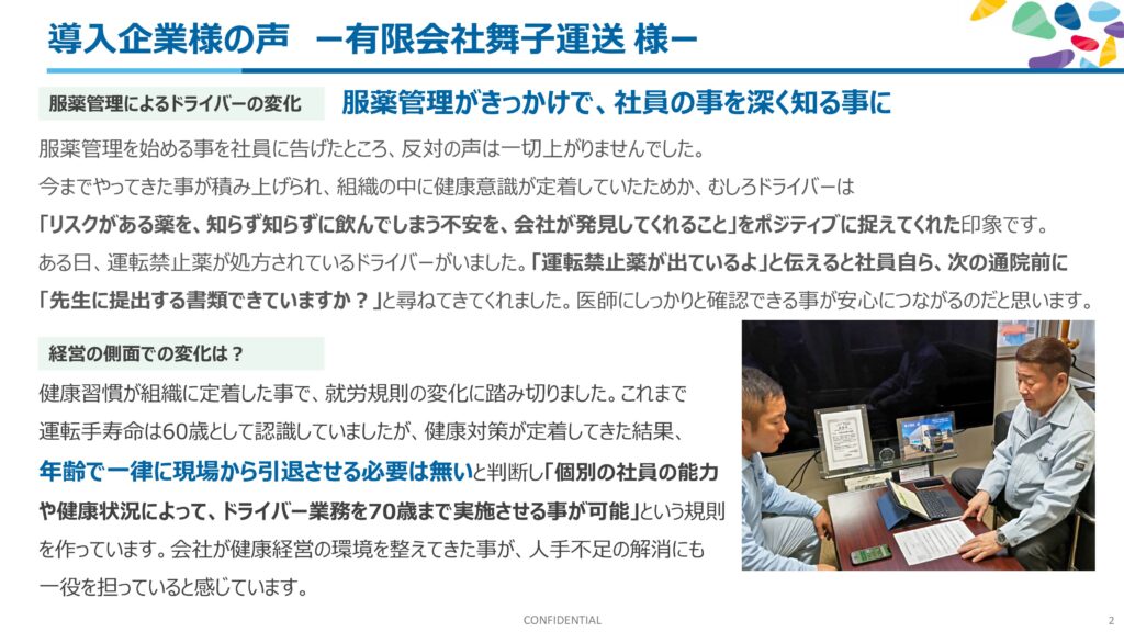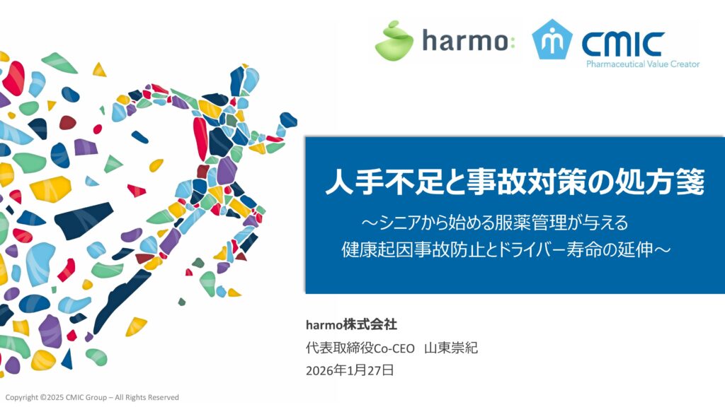 harmo株式会社 代表取締役Co-CEO 山東 崇紀様のウェビナーで弊社の健康経営の取組みの一つ、harmo株式会社の「おくすり手帳 for Driver」を使用してドライバーの服薬管理をし、運転禁止薬服用のリスクを抑える取組みが紹介されました。
