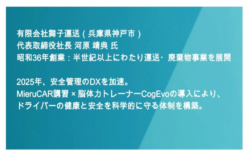 社員の脳体力強化・維持のために導入しているMieruCar講習×脳体力トレーナーCogEvoを実践するにあたって、「導入背景」「運用の実際」「事例から得た気づき」「コミュニケーションの変化」などをインタビューされた動画を実践事例として紹介していただきました。